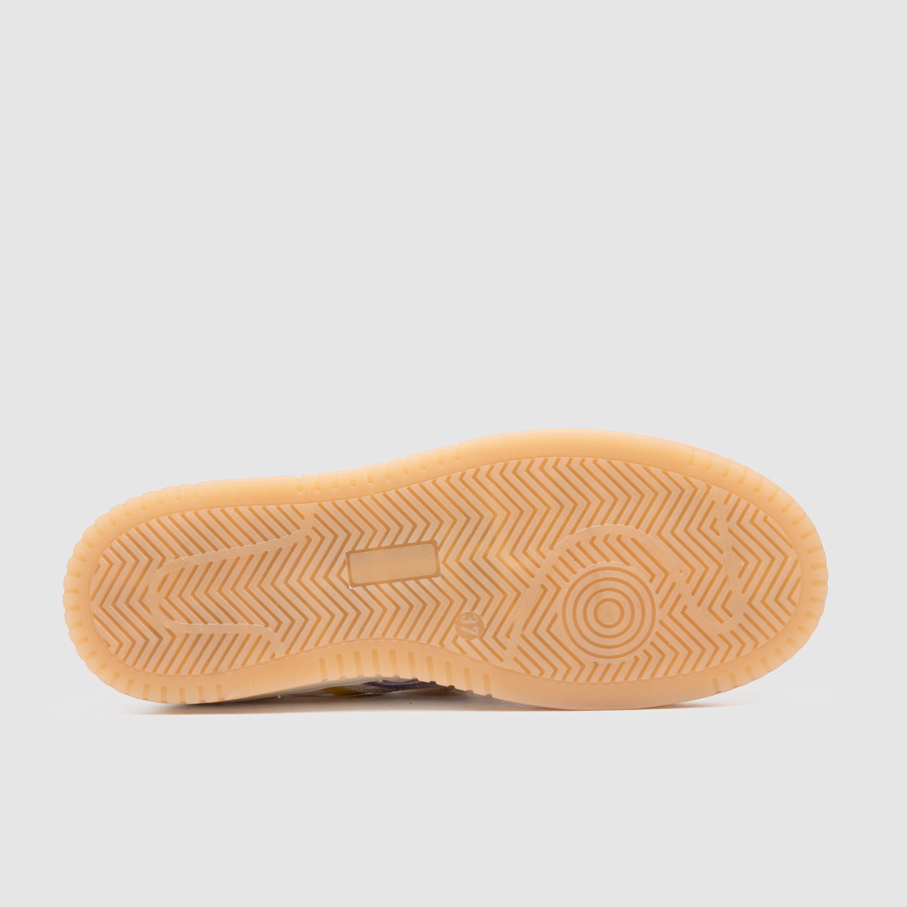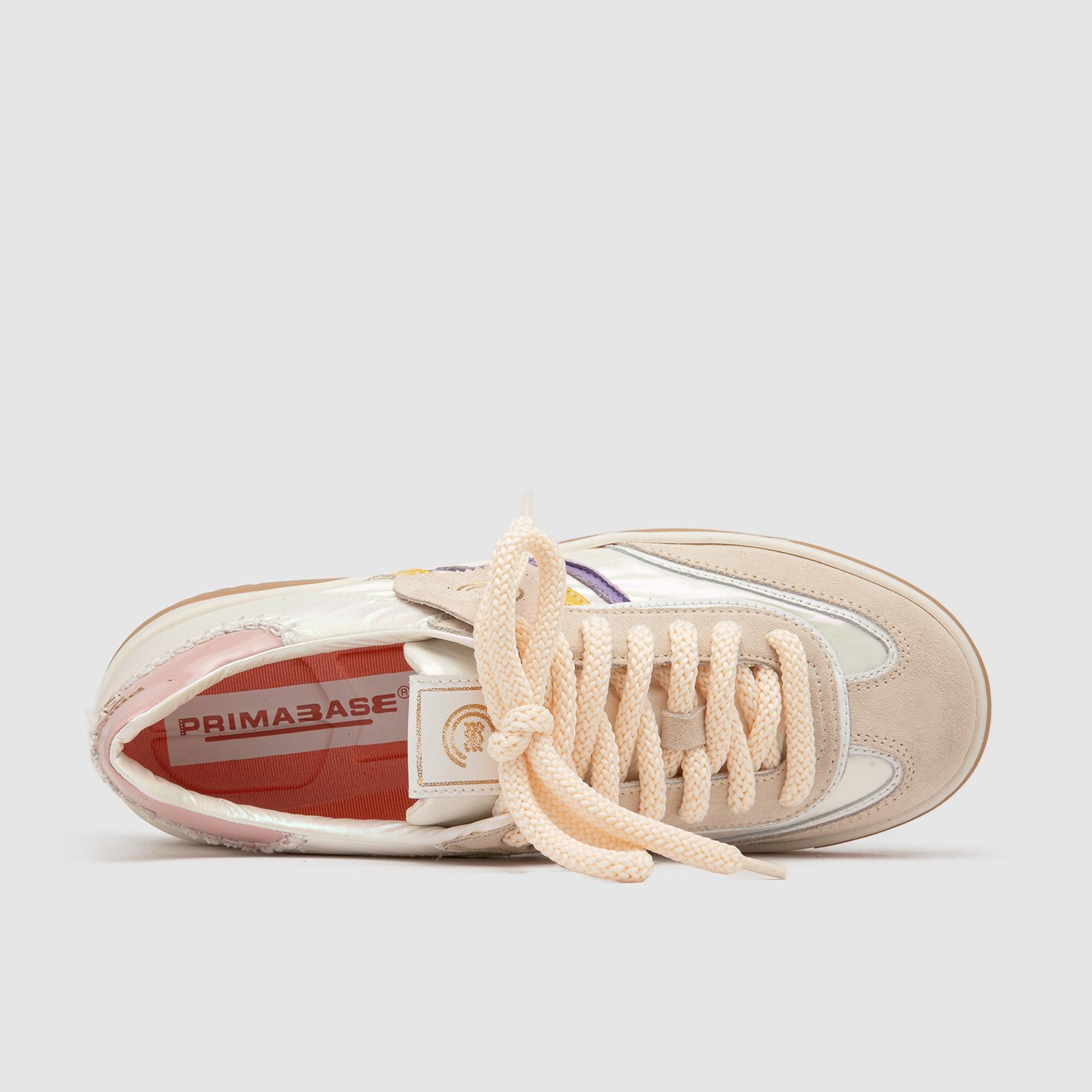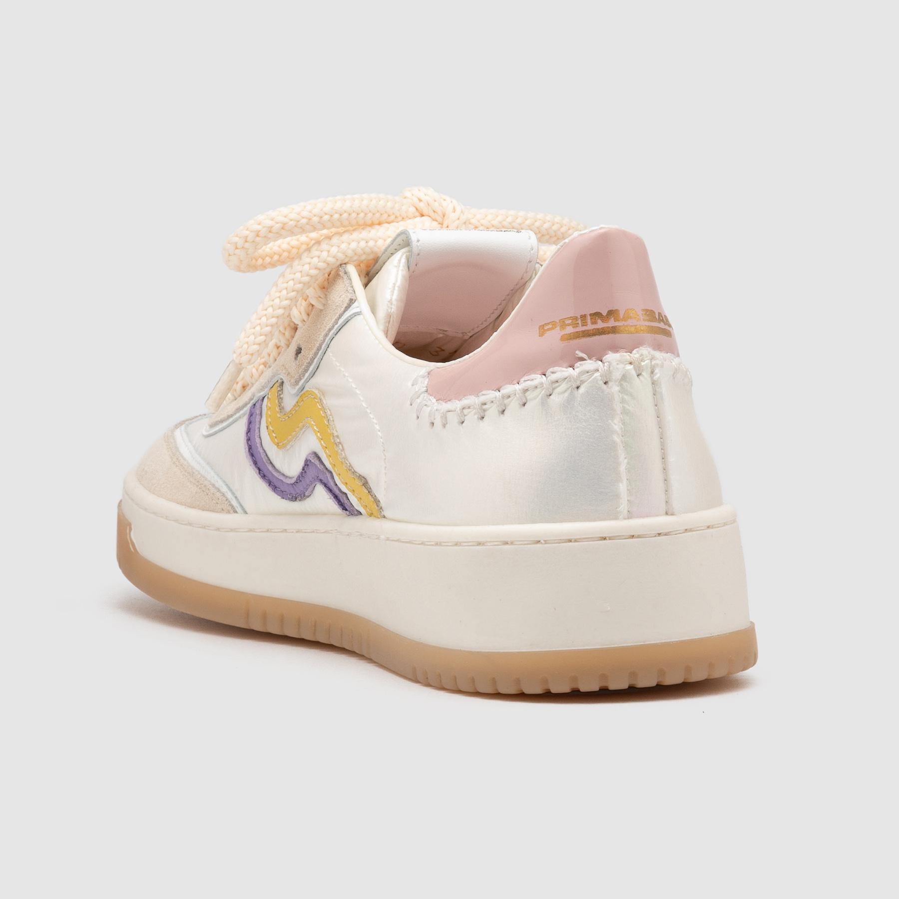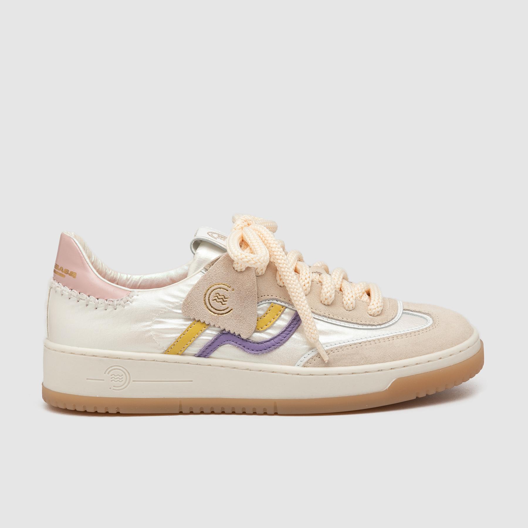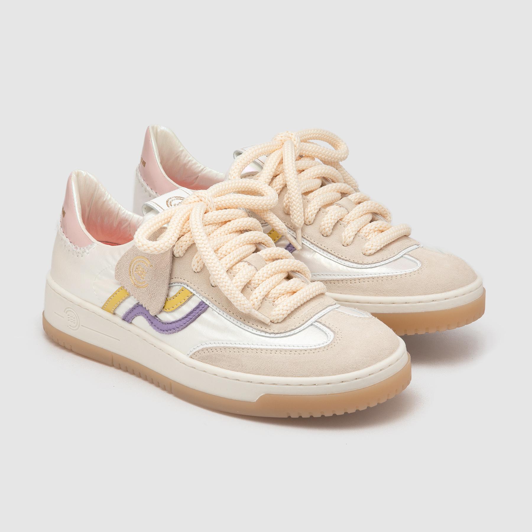 Sneaker a cassetta dal design moderno e raffinato, perfetta per chi cerca una scarpa casual donna versatile e di tendenza. La tomaia combina materiali diversi con inserti in suede e dettagli in pelle che donano profondità e carattere al modello. Le linee pulite e la palette cromatica delicata, arricchita da accenti lilla e giallo, creano un look fresco e contemporaneo ideale per outfit daily e streetwear.