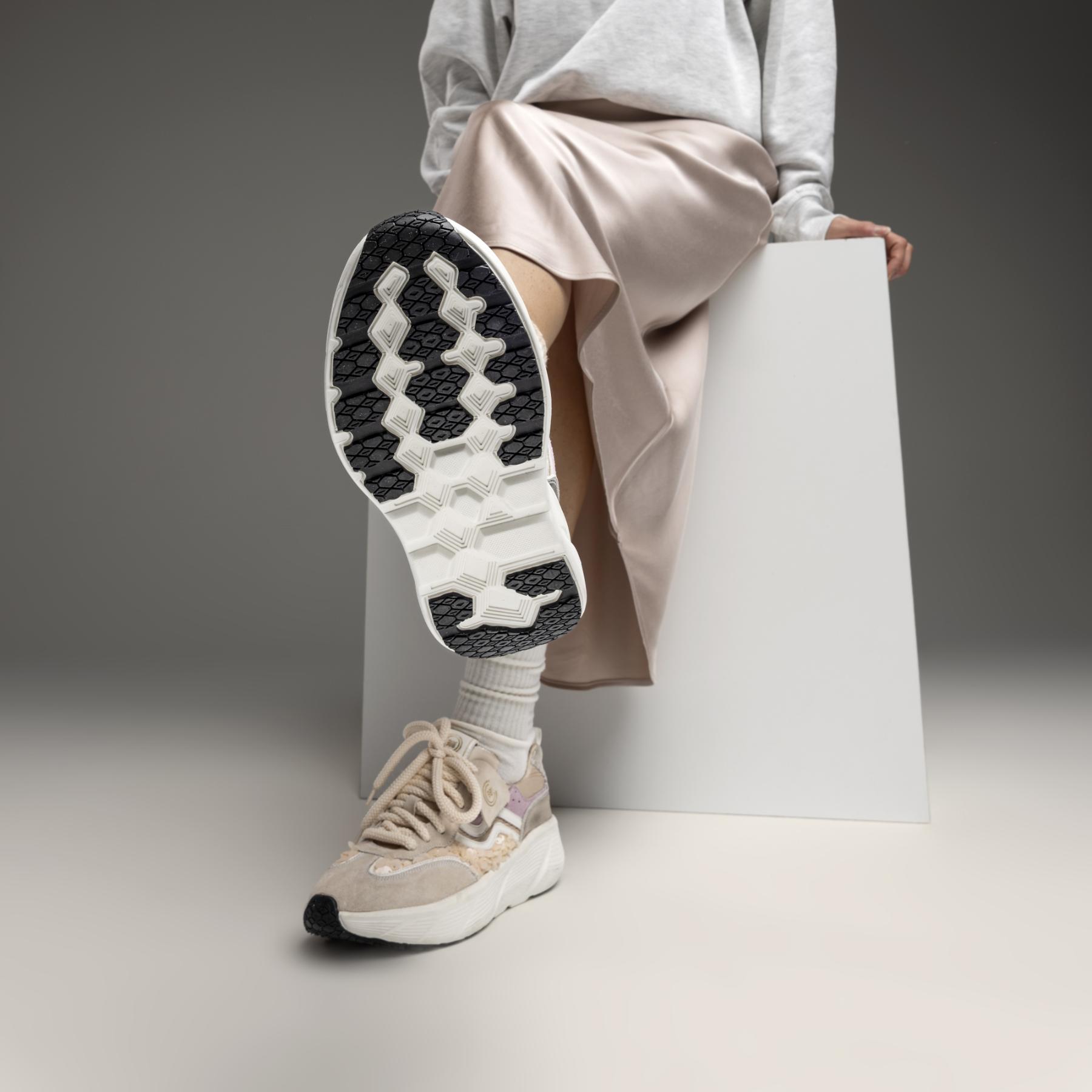La suola chunky ammortizzata garantisce stabilità e supporto durante la camminata, migliorando il comfort anche nelle giornate più dinamiche. I dettagli in tessut ed i lacci voluminosi aggiungono un tocco femminile e contemporaneo, rendendo questa sneaker perfetta per outfit casual chic e streetwear.