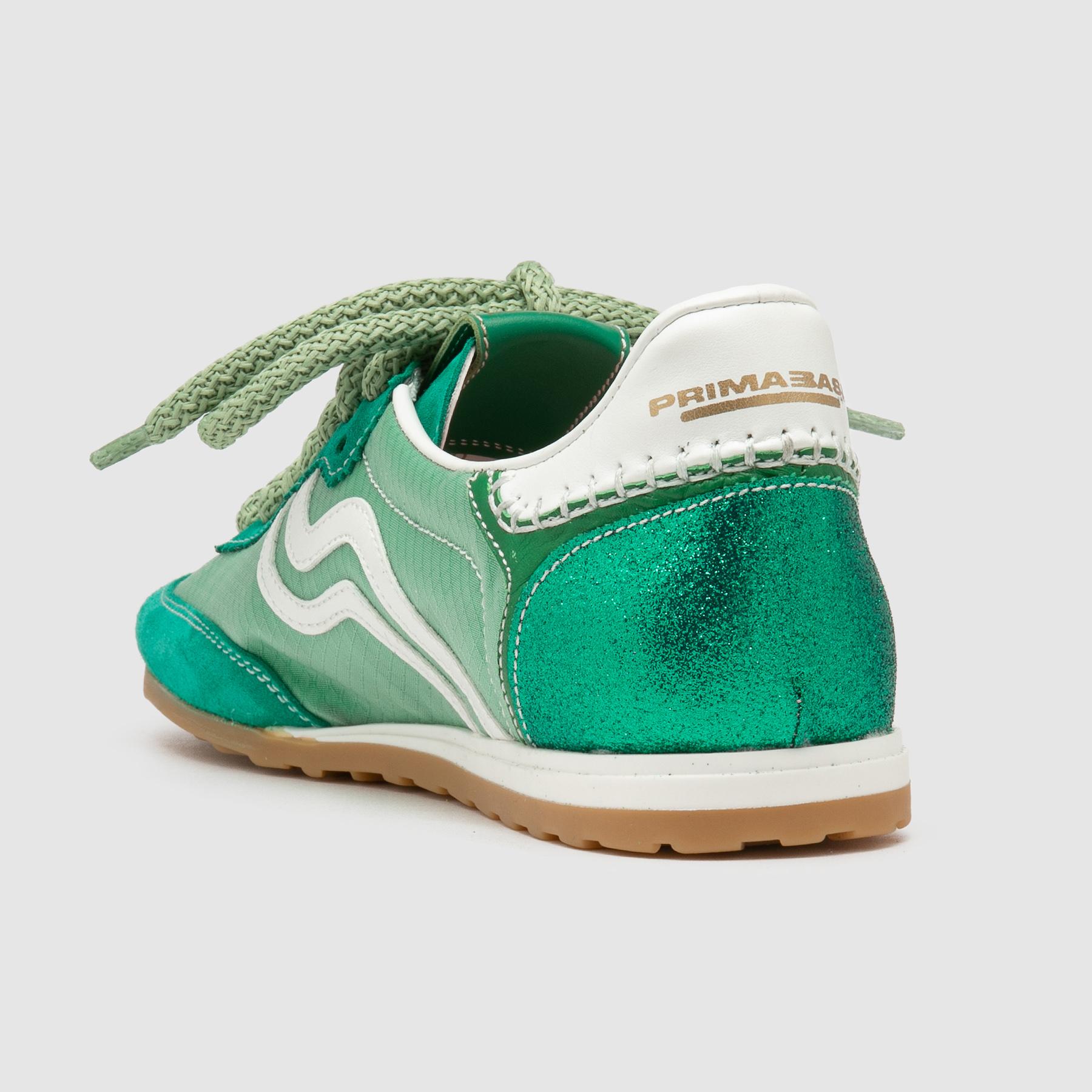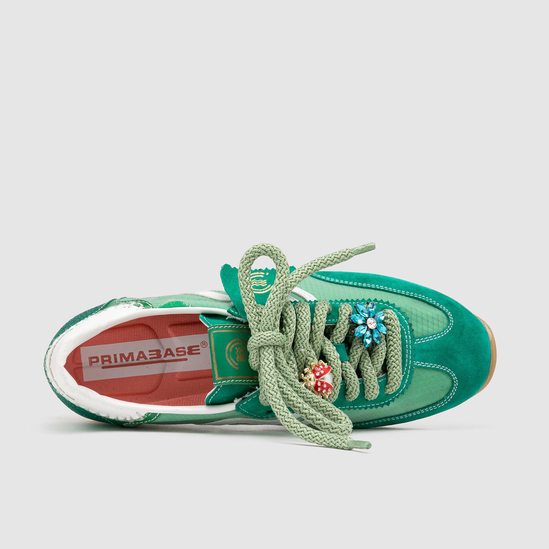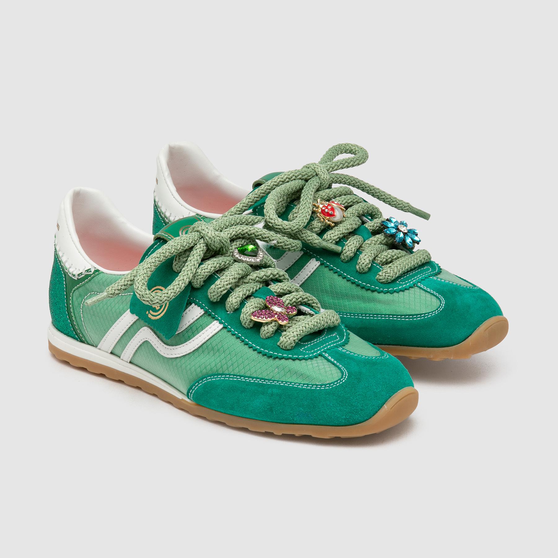 L’iconica sneaker running dal design vintage e dinamico, perfetta per chi cerca grinta e stile in un’unica scarpa. Questa sneaker da donna si distingue per la tomaia in mesh e suede verdi, abbinata a inserti laterali chiari che donano un look sportivo ma ricercato. I lacci in cotone color verde sono impreziositi da charms gioiello multicolor, un dettaglio unico per uno stile glamour.