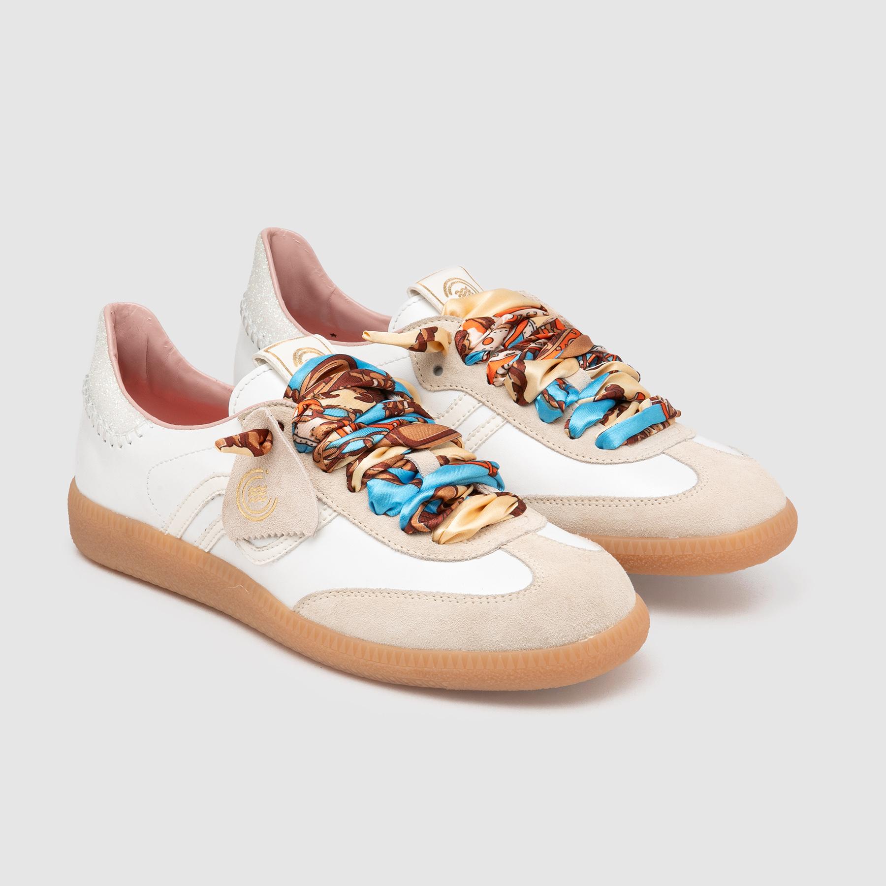 Aggiungi un tocco di eleganza casual al tuo look con le sneakers da donna Primabase modello Polo. Realizzate in pelle e suede, queste scarpe uniscono stile romantico a design sportivo retrò. Il profilo laterale a onda, il fussbett in memory rosa e la suola in gomma color miele garantiscono comfort e stile per tutta la giornata. I lacci in tessuto a fantasia completano il look, rendendo queste sneakers perfette per un outfit urbano e sofisticato.