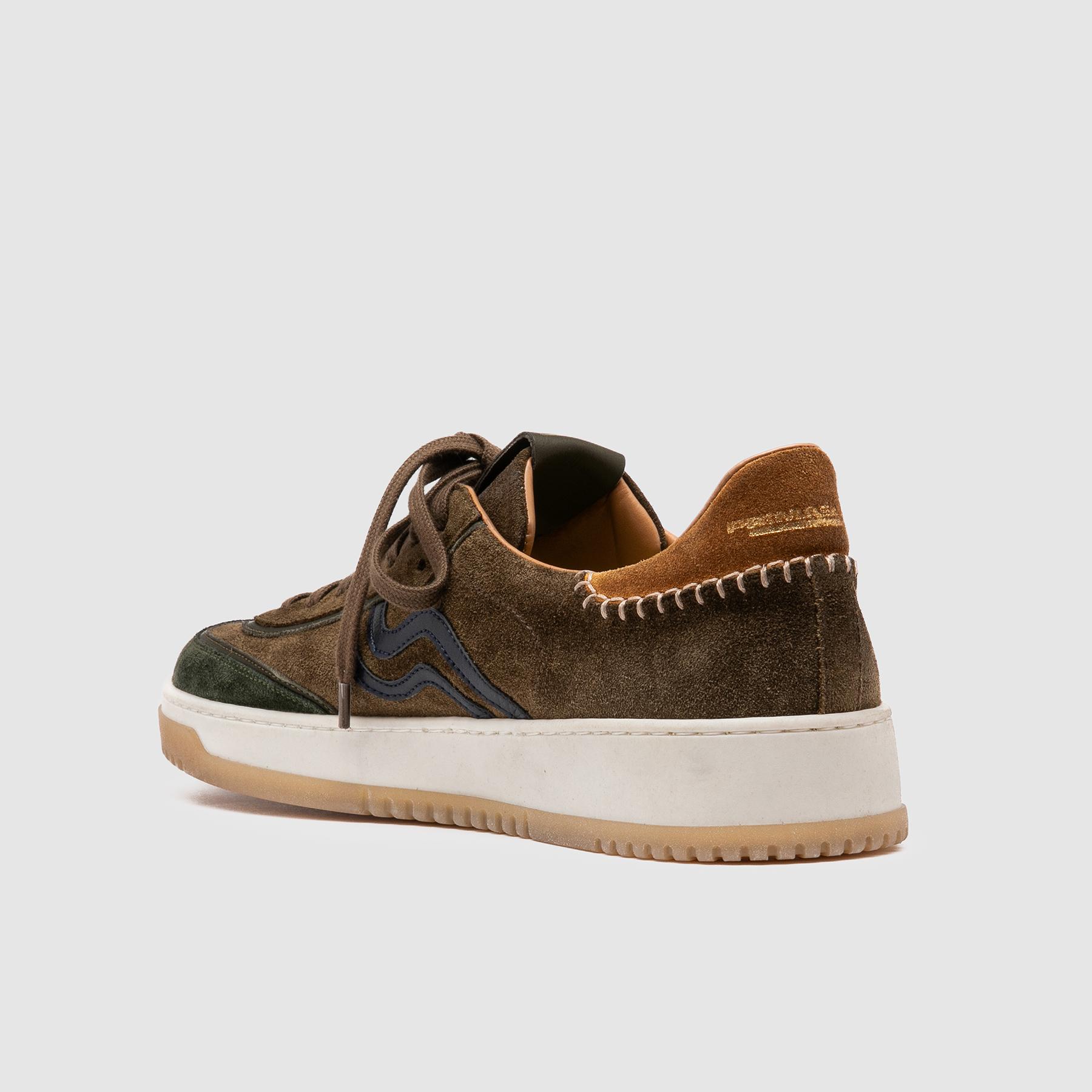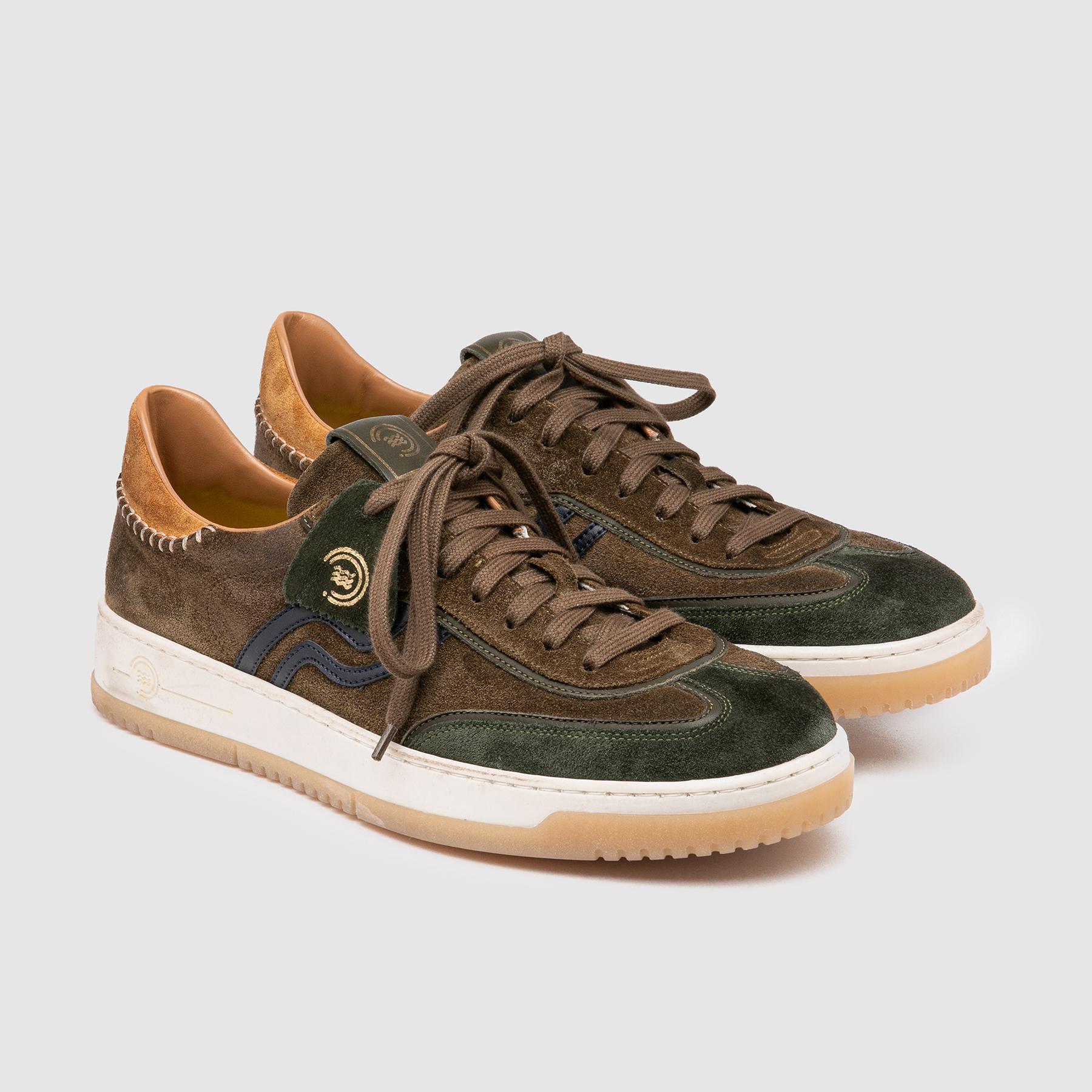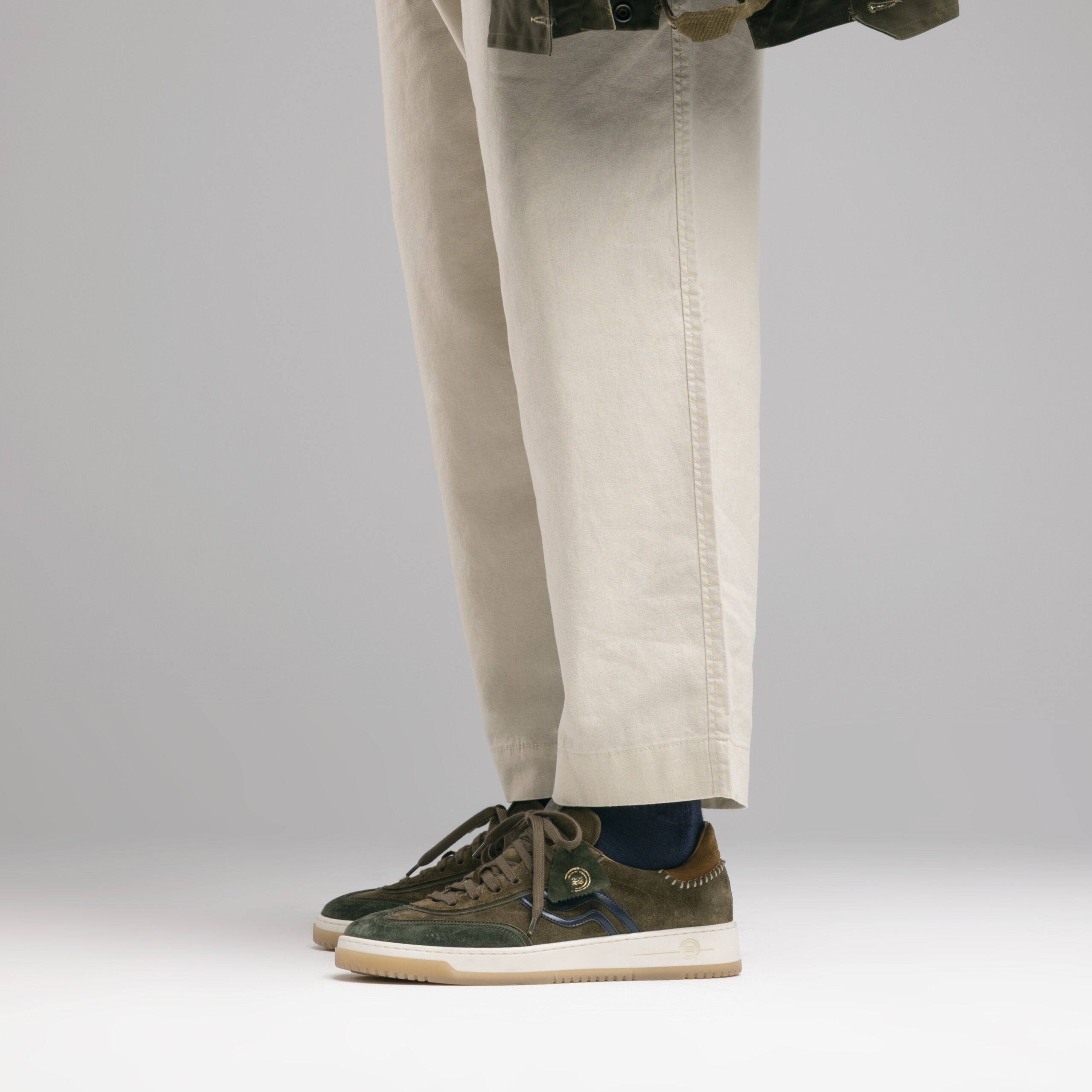 Raffinate e versatili, queste sneakers uomo sono la scelta ideale per chi cerca uno stile sportivo ma elegante. La tomaia in morbida pelle scamosciata è valorizzata da dettagli in pelle blu e tallone ocra a contrasto, con cuciture a vista per un effetto artigianale. I lacci tono su tono, la fodera in pelle color cuoio e la suola in gomma naturale con intersuola bianca garantiscono comfort e durata.