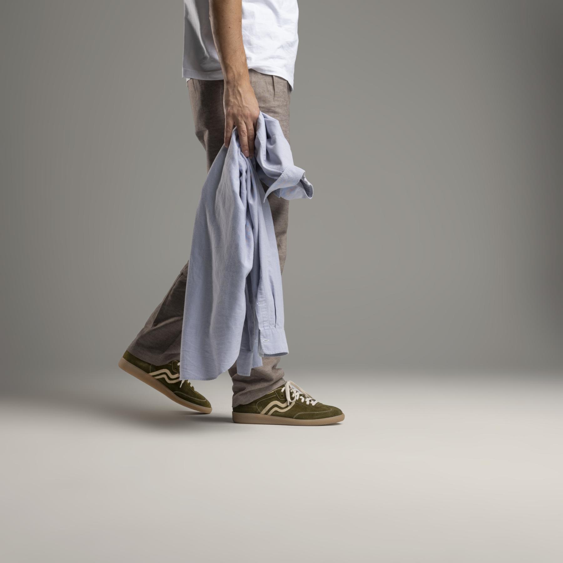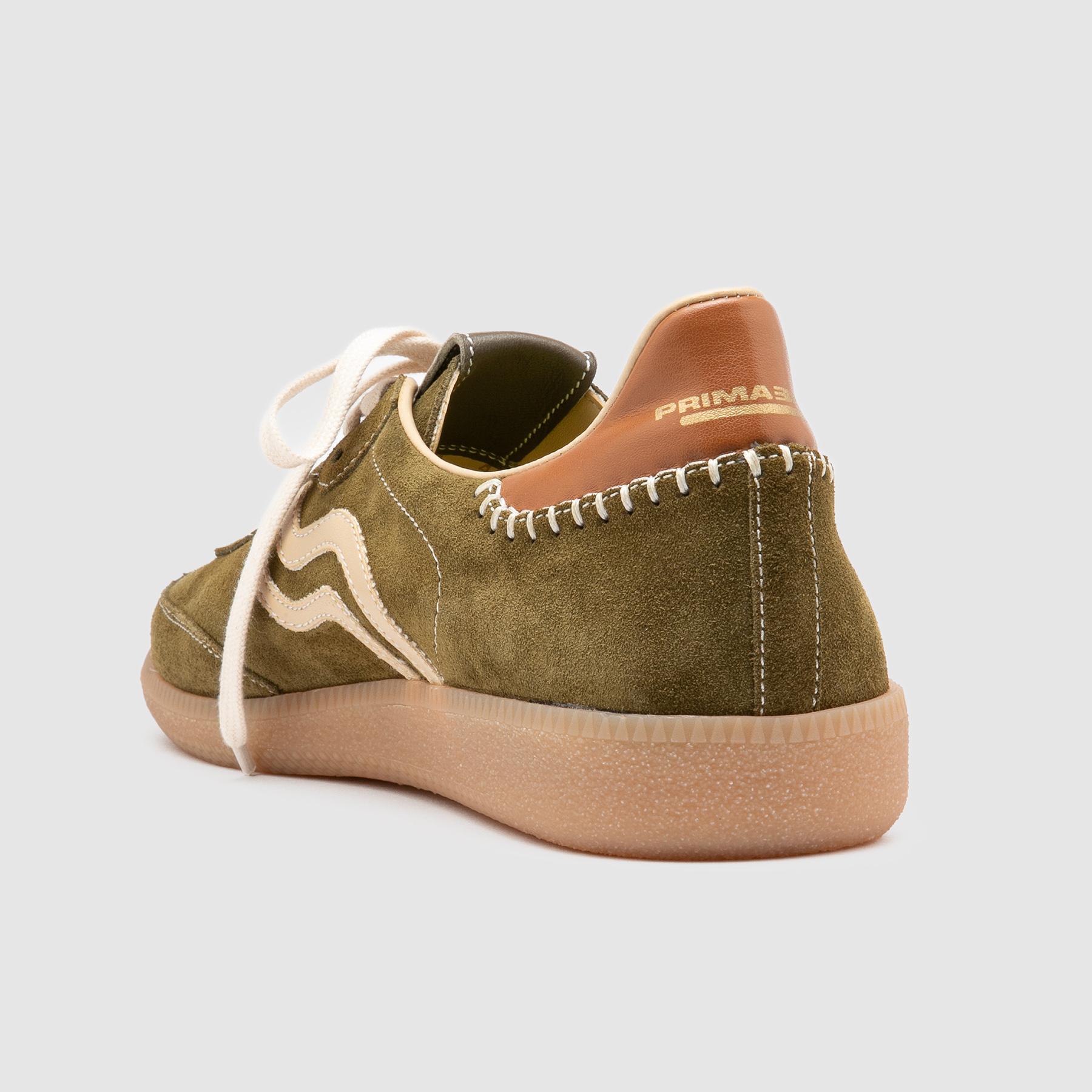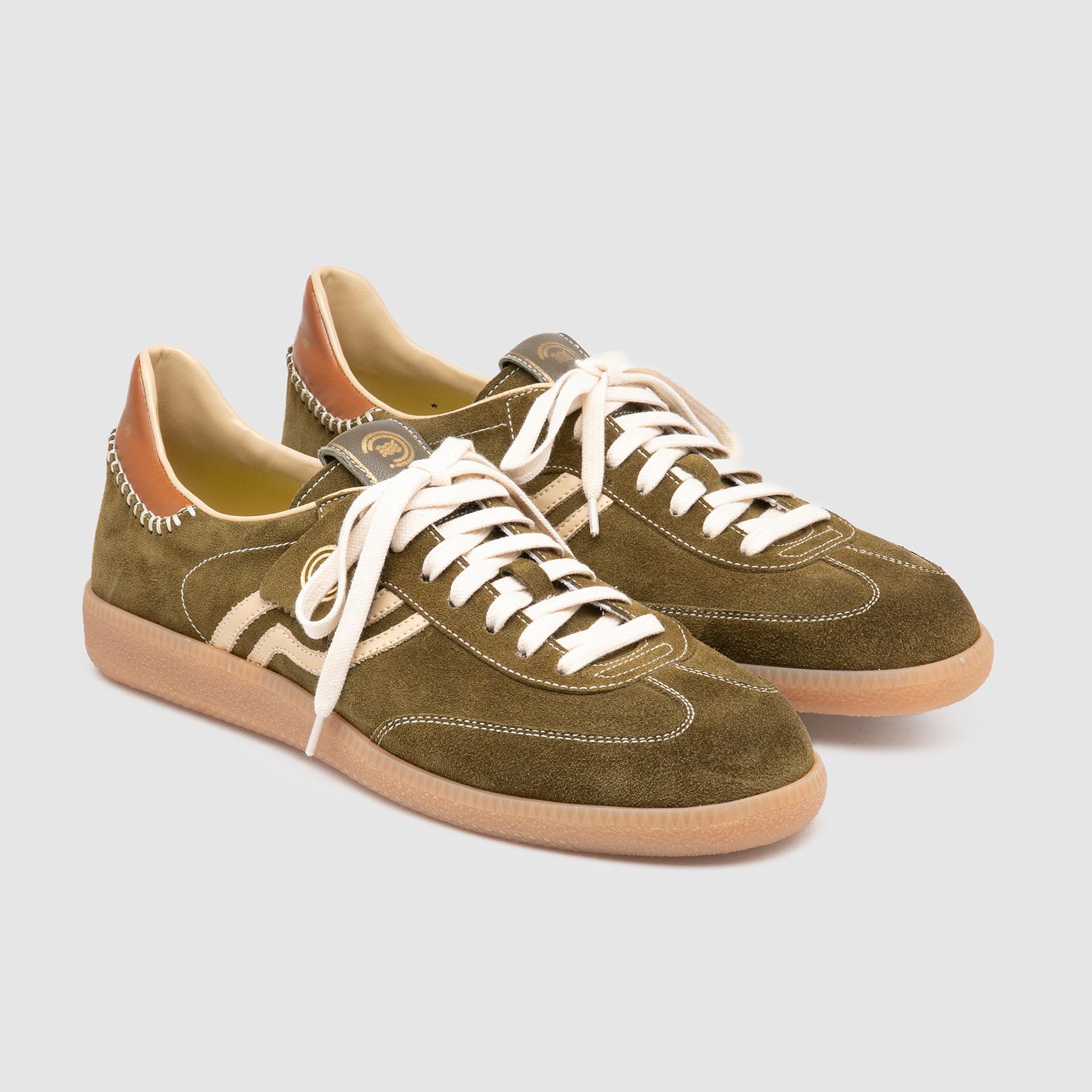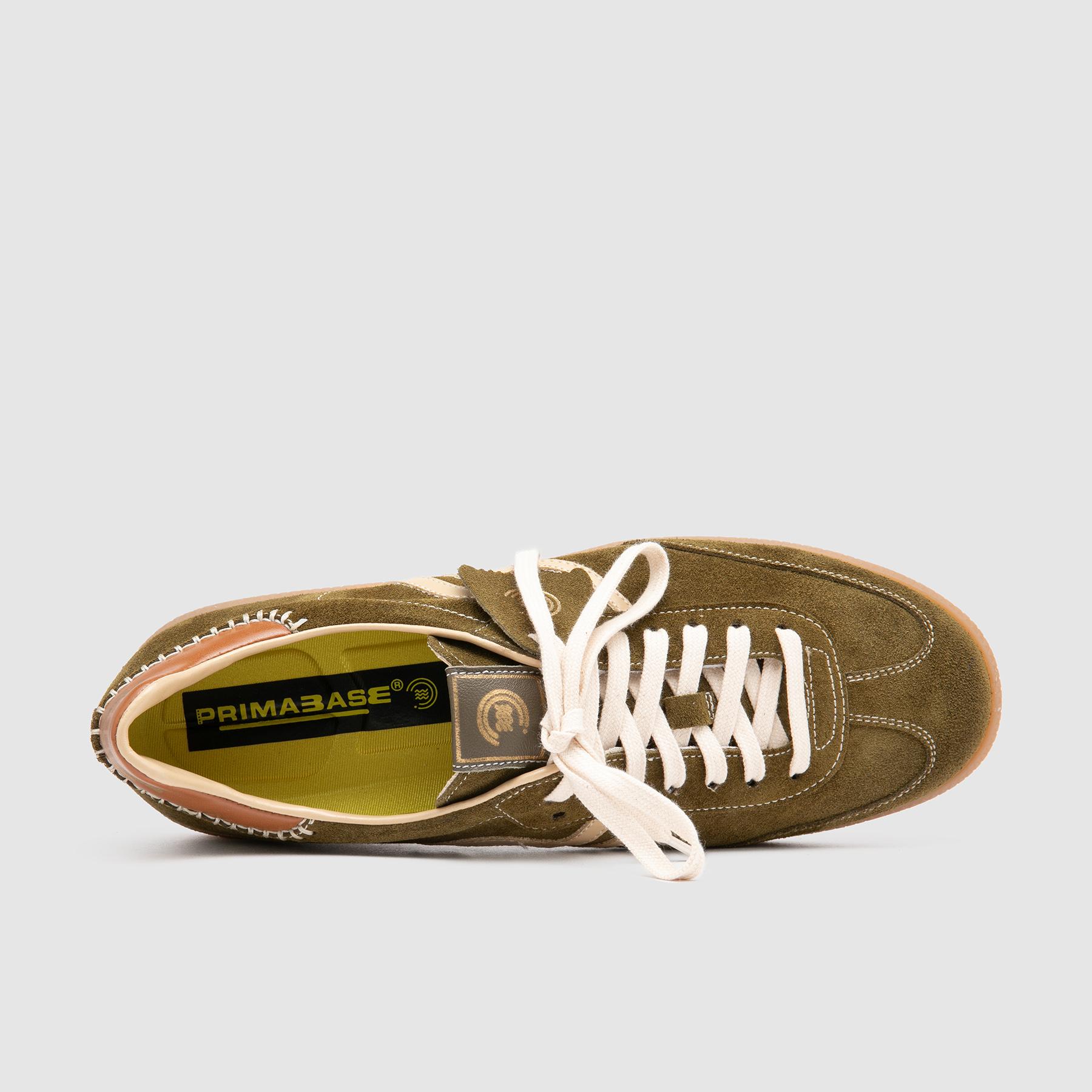Scopri le sneakers da uomo Primabase modello Polo in elegante pelle scamosciata verdone, perfette per uno stile casual-chic. Queste scarpe combinano design vintage retrò con dettagli moderni come la suola in gomma color miele e la coda di rondine in punta. Internamente foderate per garantire il massimo comfort, queste sneakers sono ideali per ogni stagione.