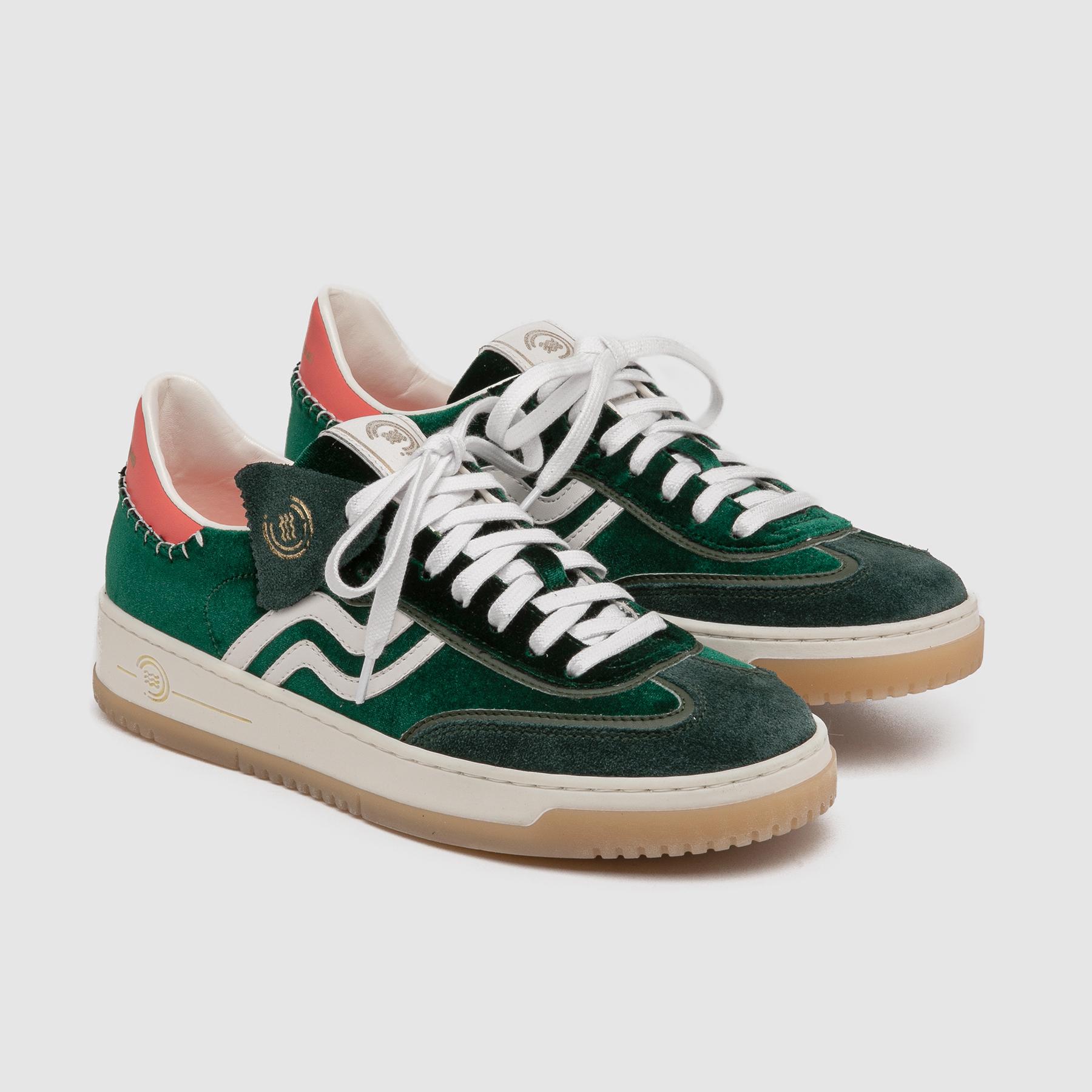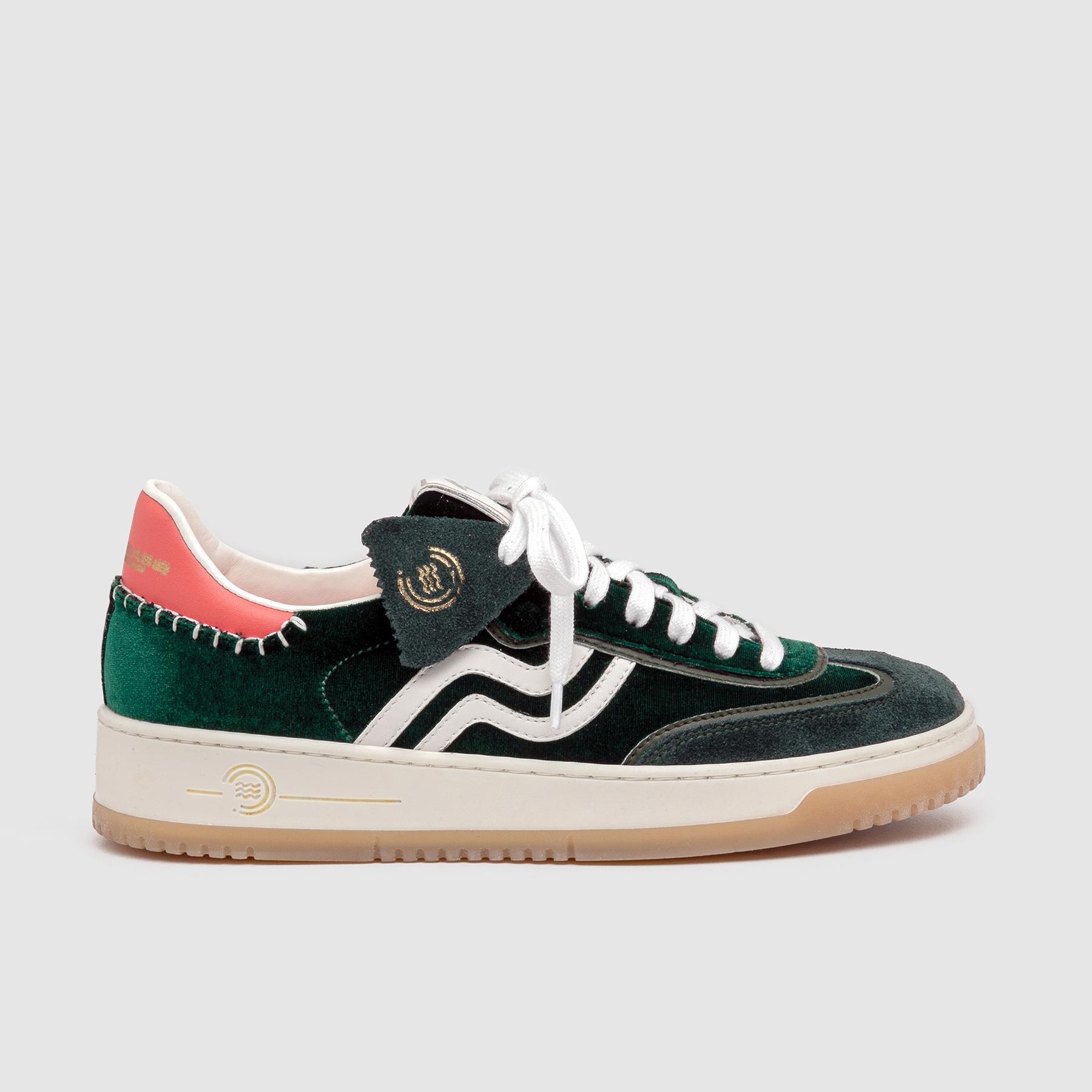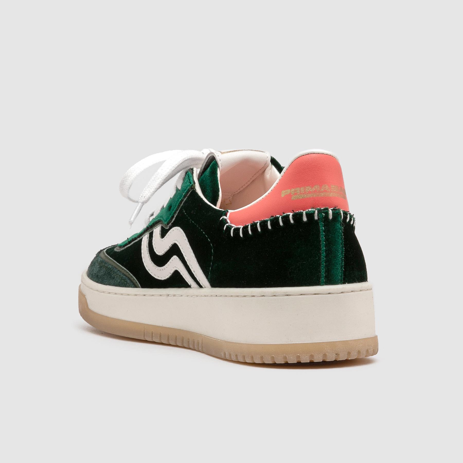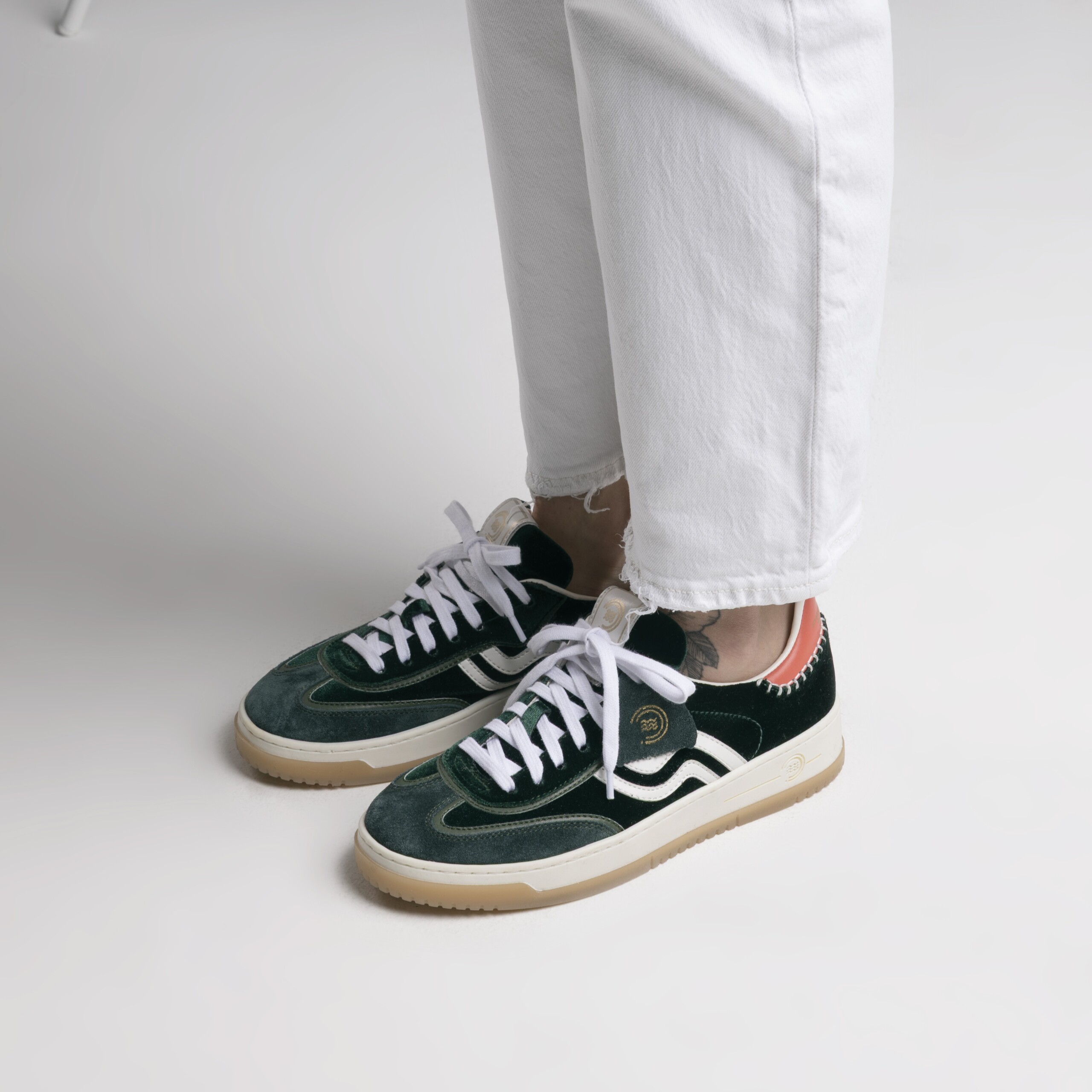 ’90s-style swallow-top basketball sneaker made of leather and velvet with two-tone box bottom for a glamorous and sporty style, perfect for adapting your looks for different occasions.